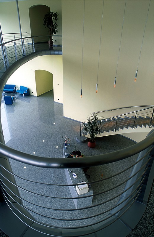 İki kanadı çalışma ofislerine ayrılan üç katlı yapıya giriş ortadaki büyük holden. Kanatlardan dilatasyonlarla ayrılan orta bölümün çatısı çelik konstrüksiyon, üst kata ulaştıran merdiven ve bağlantı koridoru ise çatıya asılı. Ön cephesi tümüyle şeffaf bu bölüm, 8,00 metre yüksekliğinde, lamine cam dikmelerle taşınan 3,00x3,00 metre ebadında eğrisel camlarla düzenlendi.